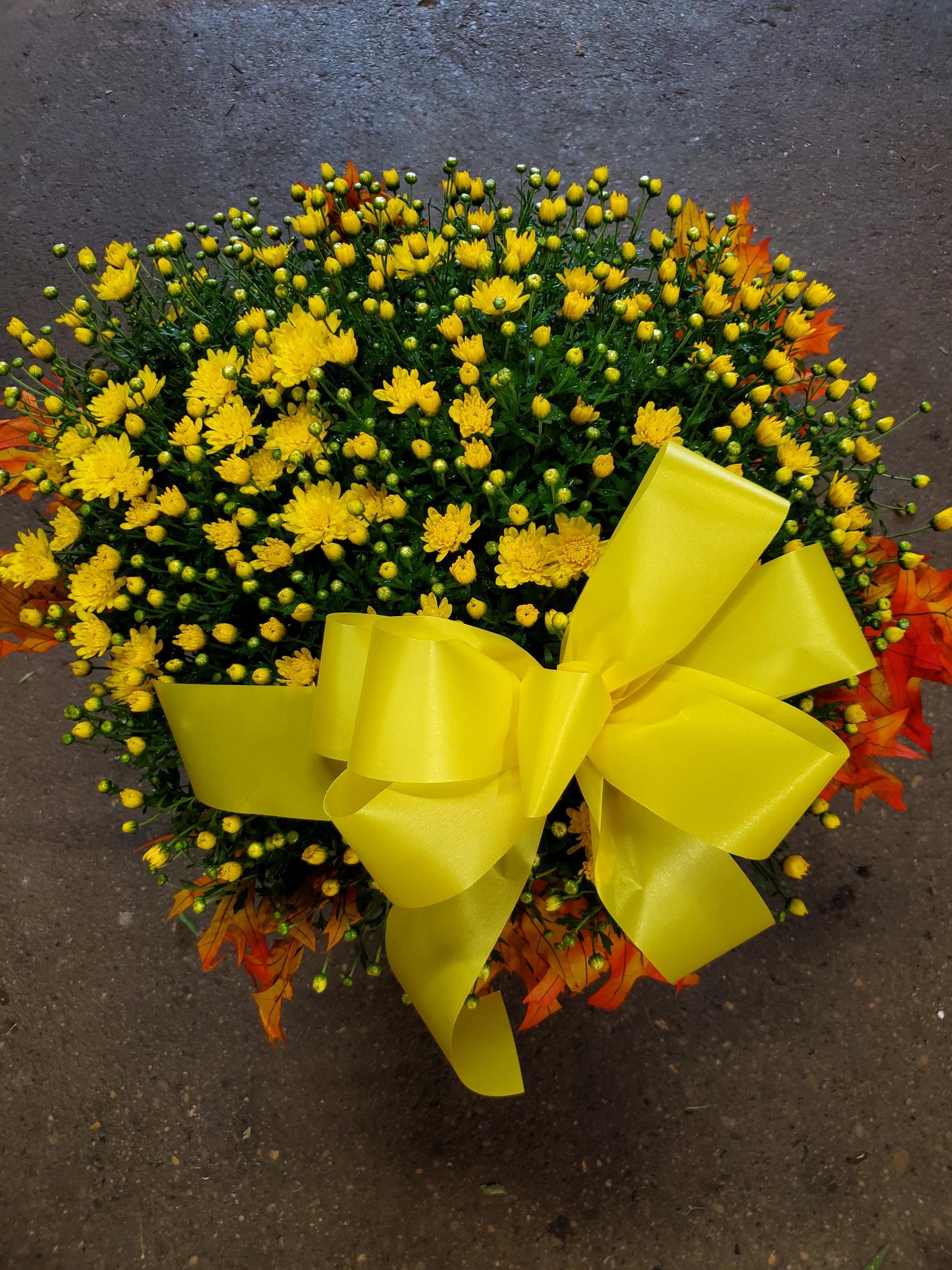 Premium is a 12" garden Mum plant accented with a ribbon and fall leaves.