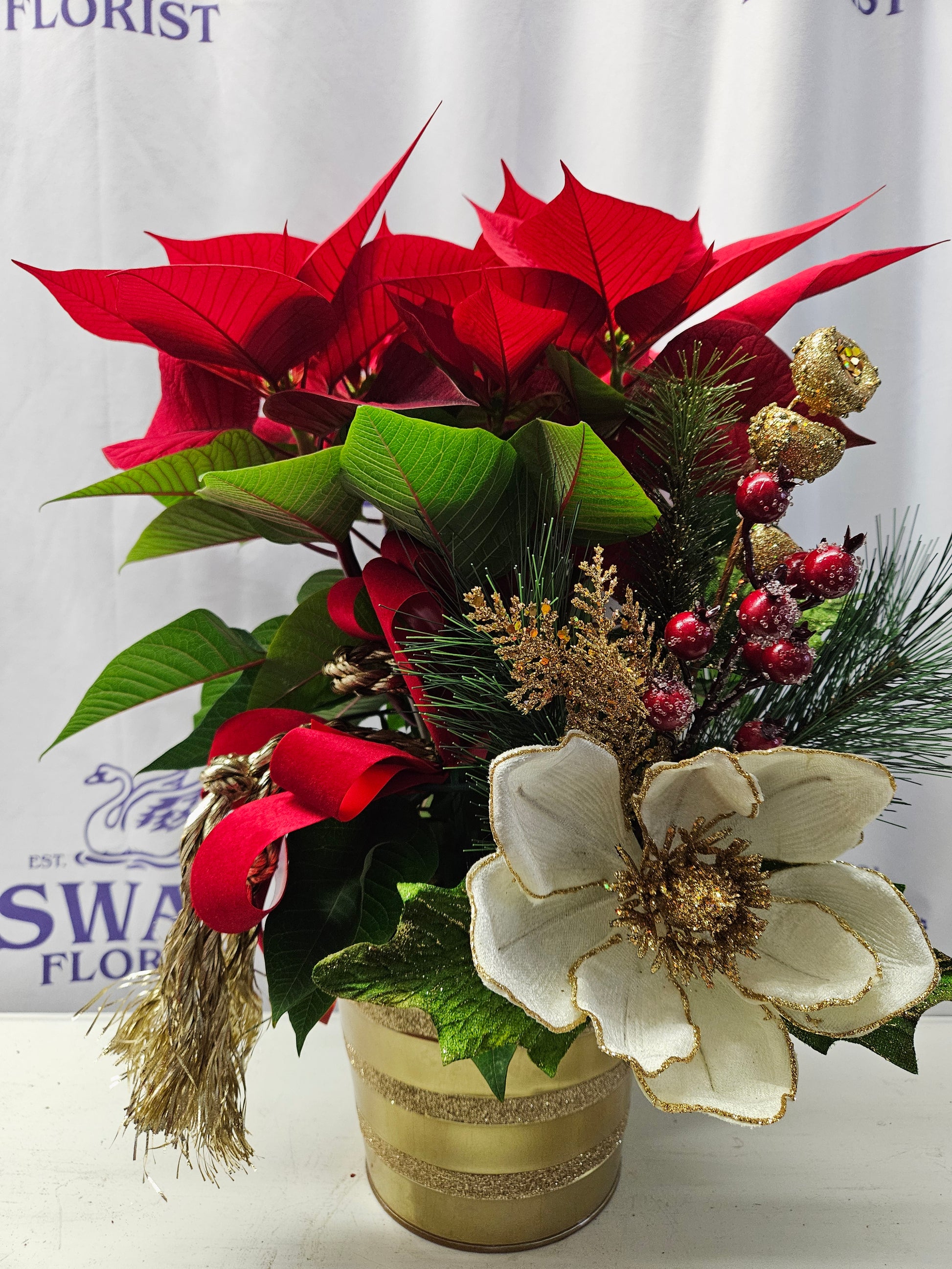 Turn on the Southern Charm with this lovely red poinsettia accented with a faux white magnolia blossom with berries